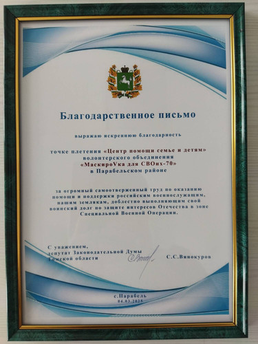 Наш коллектив получил благодарственное письмо от депутата Законодательной Думы Томской области С.С.Винокурова за поддержку российских военнослужащих в зоне СВО