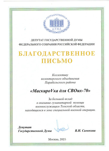 Коллектив нашего центра активно помогает воинам СВО, отправляем посылки на фронт, собираем необходимое в госпитали, плетем маскировочные сети. Наши воспитанники пишут письма, рисуют открытки, передают слова благодарности защитникам и желают скорейшей победы. Мы активные участники волонтерского движения "МаскироVка для СВОих - 70". Мы получили благодарственные письма от командира танкового батальона гвардии подполковника В.Рябова и депутата Государственной Думы В.И.Самокиша за вклад в общее дело и приближение долгожданной победы. | |