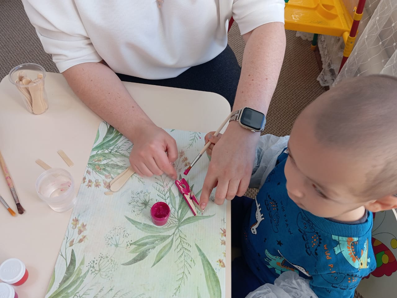 Они красили прищепки и палочки, помогали сушить детали феном, затем склеивали всю поделку. Но, конечно, без помощи своих мам и бабушек ничего бы не получилось.