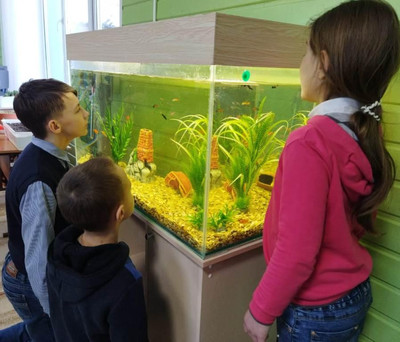 В аквариуме, подаренном сотрудниками Транснефти, появились первые обитатели - красные меченосцы, веселые гуппи, изящные моллинезии, активные сомики…